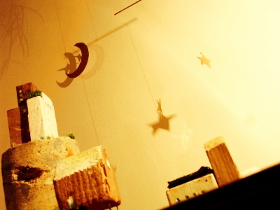 まずモビールというのは、紙やプラスチック、金属板、薄い木の板のような軽い素材を、